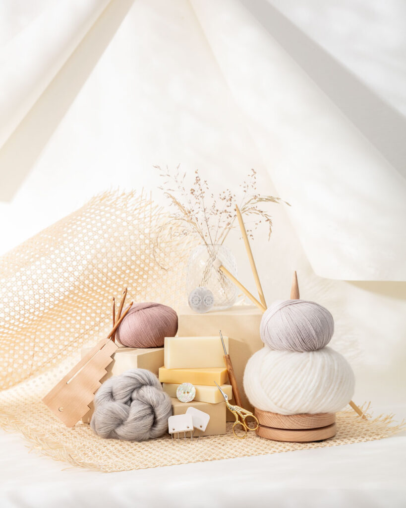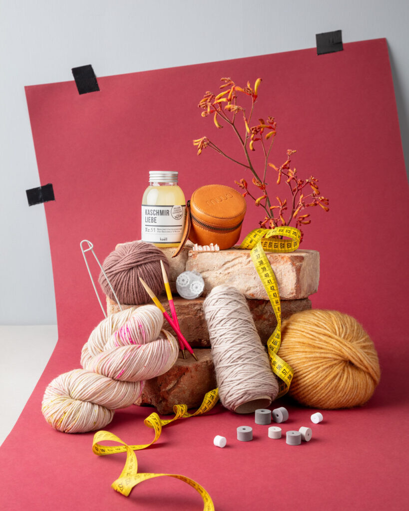 Freie Produktion eines still life Shootings für Strickmaterialien