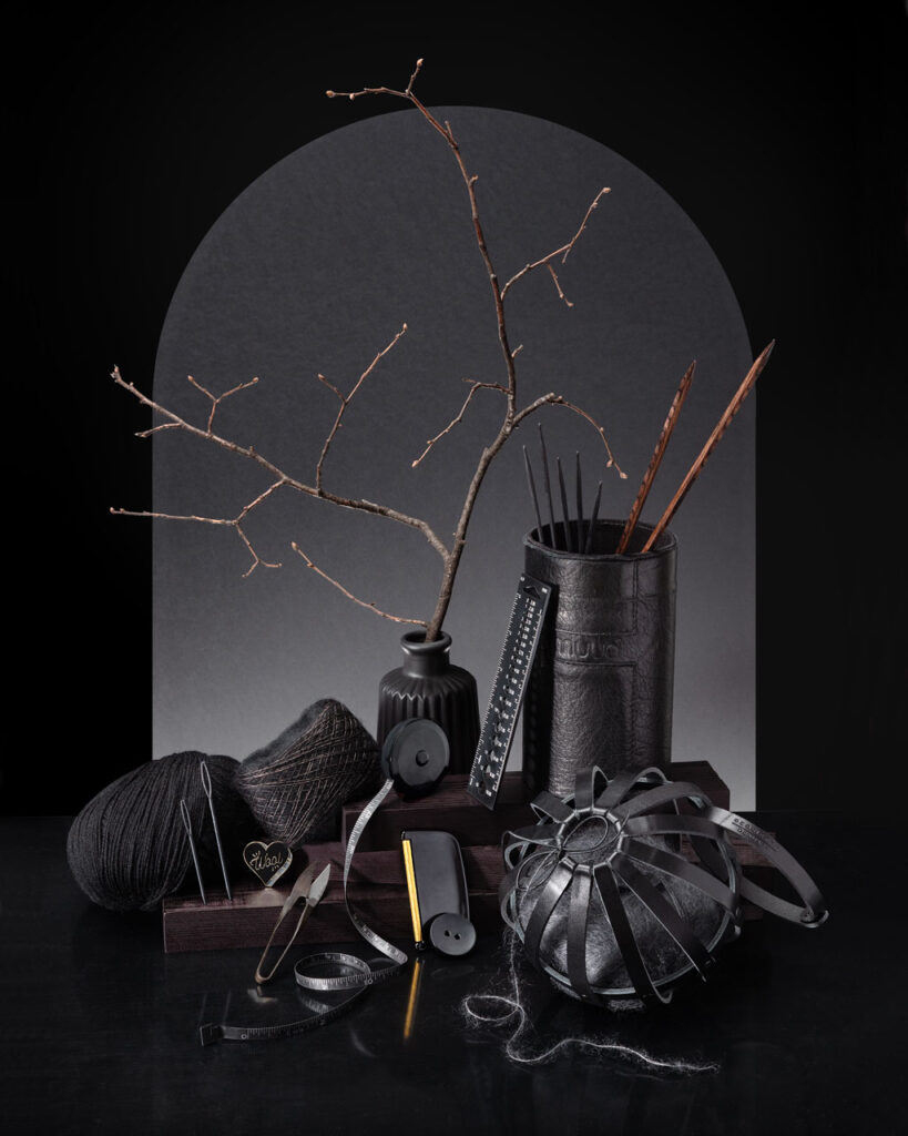 Dieses freie Shooting ist ein absolutes Herzensprojekt von mir gewesen! Der Gedanke dahinter war ganz einfach: wie würde so ein absoluter Traum-Auftrag für mich aussehen? Welche Aufgabe würde ich wahnsinnig gerne umsetzten? Das Thema war schnell gefunden, Stricken gehört inzwischen ja zu meinen großen Leidenschaften. Und so begann ich drei Motive zu konzipieren, die jeweils hochwertige Materialien und Zubehör aus der Welt des Strickens vereinen sollten. Inszeniert auf eine überraschende, unbedingt unkonventionelle Art, die mit Gegensätzen spielt und dennoch einen wirklich coolen und hochwertigen Rahmen bildet. So sind diese drei Settings entstanden und ich hatte den Spaß meines Lebens bei diesem Shooting.